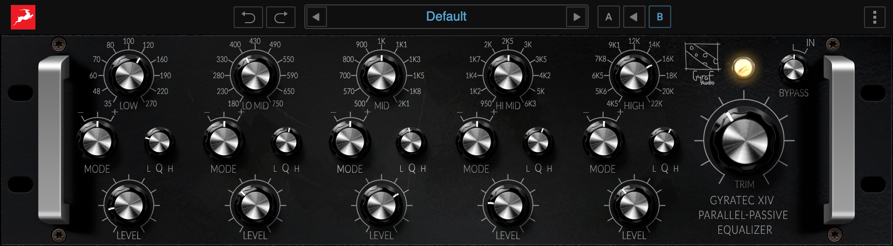Gyratec XIV is a passive stereo tube EQ inspired by the legendary Pultec design. With extended frequency controls, it is suitable for mastering or surgical equalization.