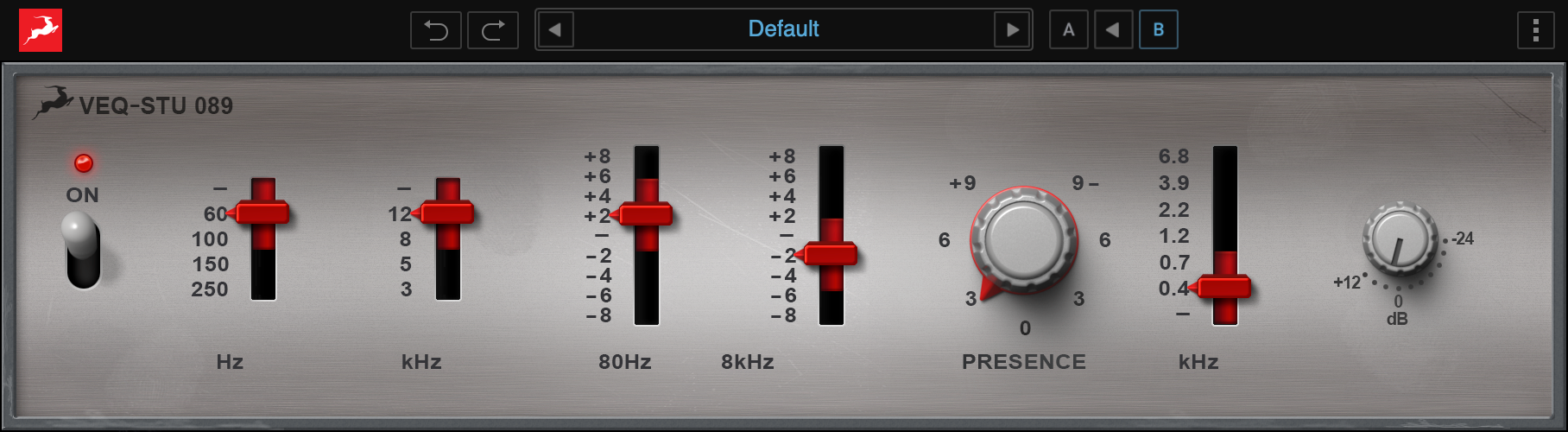VEQ-STU 089 is a semi-parametric EQ with straightforward and easy-to-master controls. Two variable filters and a presence knob are enough for this simple but powerful tone-shaping unit, inspired by a piece of classic 1970s Swiss audio gear.