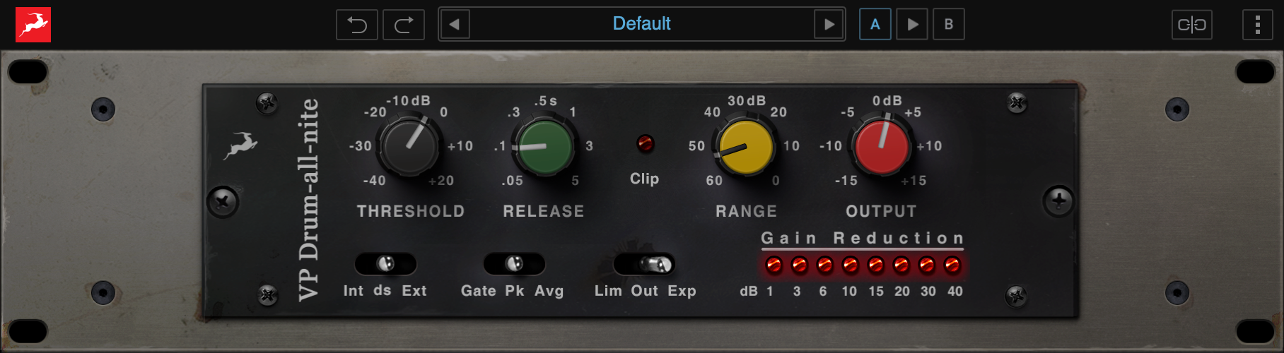 Throw the VP Drum-All-Nite in a parallel chain if you want to bring out the body of the drums. Experiment with the Limiter in Peak or Avg. mode to achieve your desired sound. This plugin will allow your drums to pierce the loudest wall of guitar sound and still sound massive. Thanks to Gate & Expander modes, especially when used simultaneously, VP Drum-All-Nite can tighten up your overall drum mix while preserving its signature punch and spit.