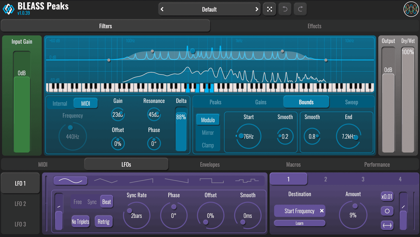 BLEASS Peaks truly comes into its own when operating in MIDI mode. In this configuration, the filter’s root frequency is controlled via MIDI coming from live-played notes or a recorded track. Better still, BLEASS Peaks can generate up to eight such filters simultaneously, making this a true polyphonic filter. MIDI control makes the filter fully playable and performable, opening up a whole new constellation of original and compelling filtering effects. Drum loops can be tuned to follow chord progressions, rhythmic harmonic pulses can be added to pads, arpeggios can be brought to life with complex frequency-shifting chorus effects… the creative possibilities are endless.