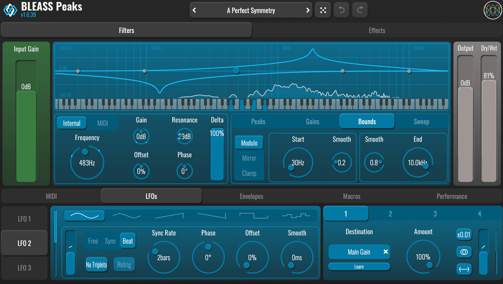 Peaks is built around BLEASS’ advanced multi-peak polyphonic filter design. When set to Internal control mode, this creates a single bell-filter curve containing up to 32 resonant peaks/notches. Details of the filter curve, such as the quantity, root frequency, and spread of the peaks/notches, are set parametrically, making it easy to shape the filter’s response and bring it to life via the plugin’s synth-style modulation sources.
