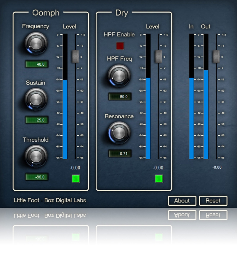 Little Foot lets you add anything from subtle to extreme low end to your kick drum without compromising the original sound. It does this by triggering a low frequency sine wave that plays along with your original kick drum. You can control how deep and how hard this sine wave triggers, and how long it sustains. You can even “tune” your kick drum to match the key of the song.
