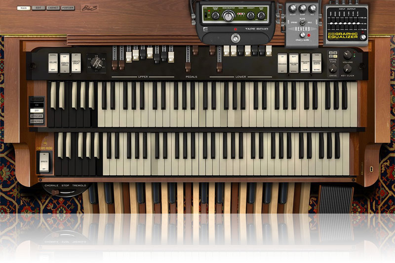 Cherry Audio's Blue3 features a new, beautifully designed user interface with Main, Edit, Cabinet, and Perform sections. And it goes beyond the traditional B3 sound by adding three studio-quality stompbox-style effects: Tape Echo Delay, Reverb with Spring, Plate, and Hall, and a Seven-band Graphic EQ.