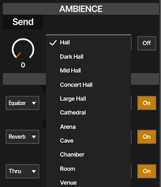 • Hall • Dark Hall • Mid Hall • Concert Hall • Large Hall• Cathedral • Arena • Cave • Chamber • Room • Venue • Ambience • Wooden Room • Brick Room • Studio Booth • Small Room • Living Room • Office • Warehouse • Music Club • Plate • Small Spring • Bright Spring • AmpSpring