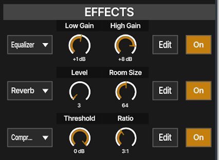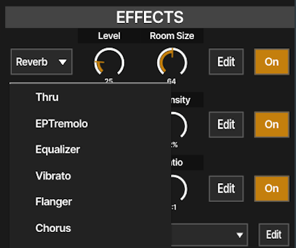 with Damper noise, Hammer Noise, Key Off Noise, Off Noise, Bell, Mic, Line