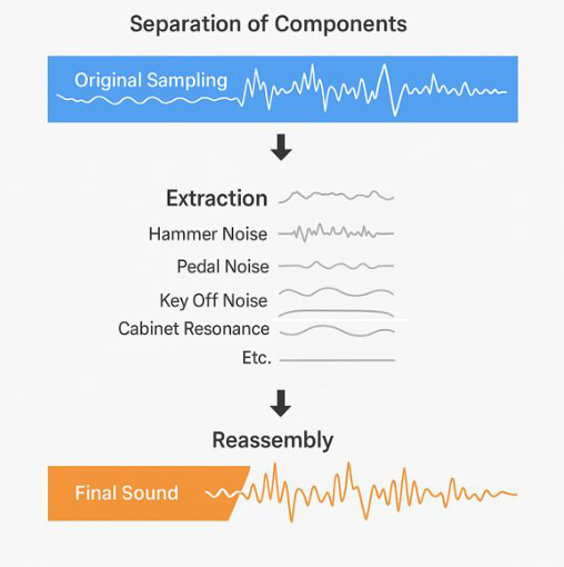 Rather than capturing composite notes alone, T2L involves the precise extraction of multiple micro-components from the original source, including hammer impact noise, key release (key-off) artifacts, pedal resonance, mechanical action noise, cabinet resonance, bell sound, and more.