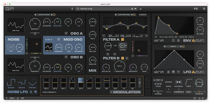 At MAP’s heart are three unique oscillators, including a dedicated modulation oscillator, that echoes the West Coast ethos of deep, flexible tone-shaping. You can twist amplitude, frequency, and waveshape into entirely new forms, then run them through dual filters: a five-band resonant EQ and a versatile multimode filter, in series or parallel. Add a nine-type noise source for grit and atmosphere, and you’re working with raw sonic clay ready for adventure.