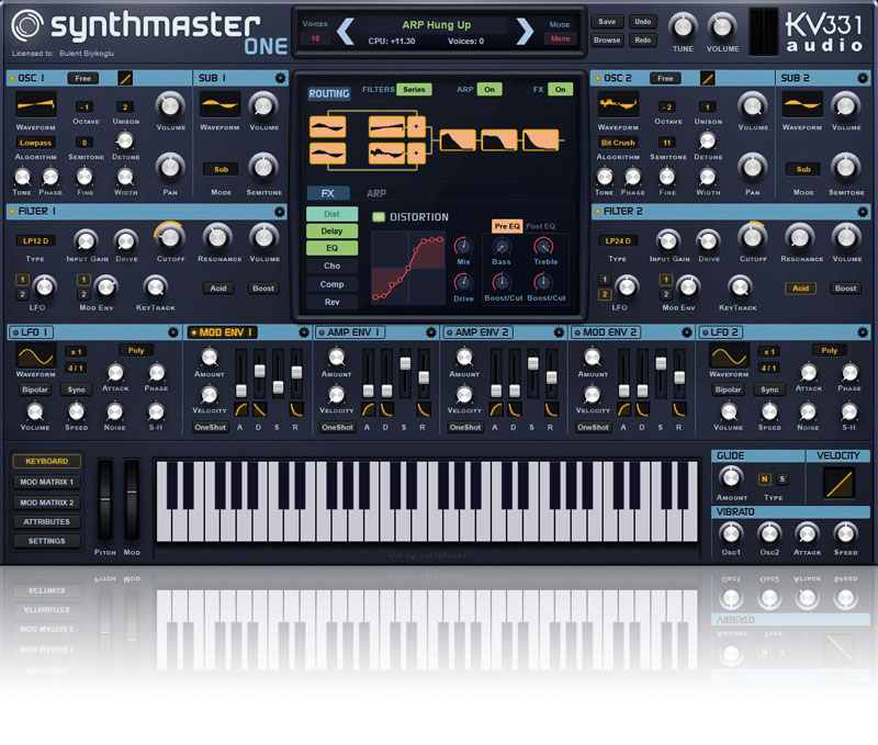 Semi-Modular Architecture: For each SynthMaster One instance, there are 2 oscillators with 2 sub oscillators, 2 Filters, 4 ADSR Envelopes, 2 LFOs, a powerful 16 step arpeggiator/sequencer and also 11 different efffects that can be inserted on to 6 FX insert slots. The sub oscillators can be connected to the oscillators in 5 different modes which let you use it as a regular sub oscillator or do complex modulations such as ring modulation, amplitude modulation, phase modulation or frequency modulation.