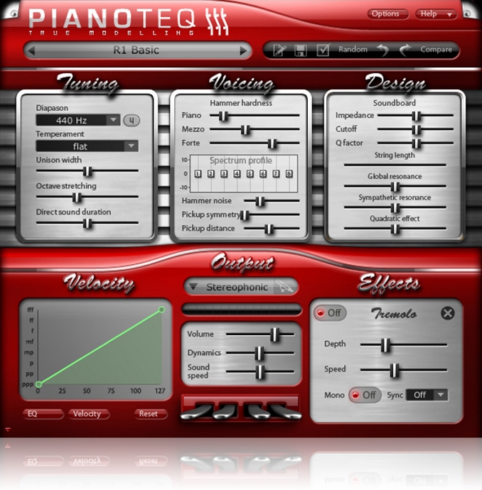 As from version 4.1 of Pianoteq, you can now enjoy the newly developed successor Rhody R2 which is a free update and replacement of Rhody R1. The sound, presence and response are all improved with increased accuracy. By using the new exciting effects in Pianoteq 4, such as Amp, Chorus, Tremolo, the new Tine noise parameters, or even the Blooming parameter (firstly intended for the Steelpans add-on), the Rhody R2 can be transformed into amazingly expressive variants. Make sure to explore the rich selection of factory presets provided.