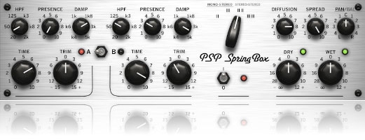 PSP SpringBox is an emulation of a hardware spring reverberator (VST, AAX and RTAS for Windows; AudioUnit, VST, AAX and RTAS for Mac OSX). It recreates several features typical of a spring reverb, such as a convincing “boing” on transients and a repeatable resonating musical character with an adjustable presence. A selection of configurations from two to six springs total is provided, as well as the ability to set stereo spread and pan/balance configured to suit various mix setups - from a typical guitar reverb to a creative uses as a send reverb in the mix. Thanks to PSP SpringBox’s two channel A and B settings setup and range of presets operation is fast and easy.