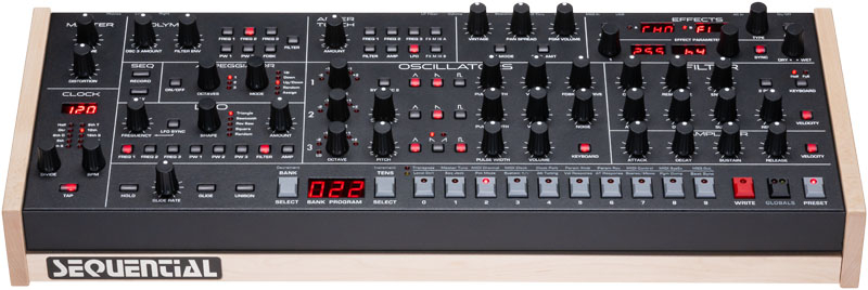 Also present is Sequential’s classic Poly Mod, with enhancements for creative sound design. Modulation sources are filter envelope and oscillator 3 (both with bi-polar control). Destinations include oscillator 1, 2, and 3 frequency, oscillator 1, 2, and 3 pulse width, filter cutoff, and feedback. Unison mode is here as well, featuring configurable voice count (1-6 voices for up to 18 simultaneous oscillators) and key modes.