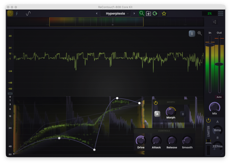 This effect has 2 banks for the transfer function, and a morph knob to let you move between them. Adding a bit of automation to the morph, you can also create a dynamics curve that evolves with the music in all sorts of ways.