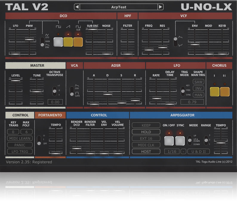 TAL-U-NO-LX is a complete rewritten emulation of the popular hardware with a new engine and GUI. Up to date zero feedback delay filters and carefully calibrated controls make this synth a good replacement for the analog device with all the advantages software plugins have. As an addition, the TAL-U-NO-LX also supports portamento and different filter LFO waveforms and some more useful features. An arpeggiator with different sync modes and hold function is also included. A very fast envelope with a smooth roll-off, emulated inaccuracy and a very smooth filter sound gives this synth the typical sound. The synth was calibrated after a hardware device that's property of TAL.