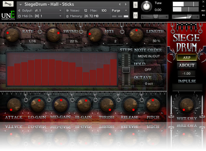 We recorded (in both venues) the drum being hit by hands, a large leather mallet, a rattan, as well as traditional sticks each giving the drum a very unique timbre. Every hit has 4X Round Robins and up to 5 velocity layers. 14 patches in all, this drum can have some serious low end or even masquerade as a tom, open snare, or frame drum. If played together these patches can sound MASSIVE. Also included are a series of FX and rolls adding a nice bonus to the entire package. Like Ambient Metal Percussion, the GUI has all of the same tweaks and features from an Arpeggiator, to pitch control, 13 custom Impulse Responses, a dry / wet control, and even the ability to control the EQ, attack, and release of the samples!