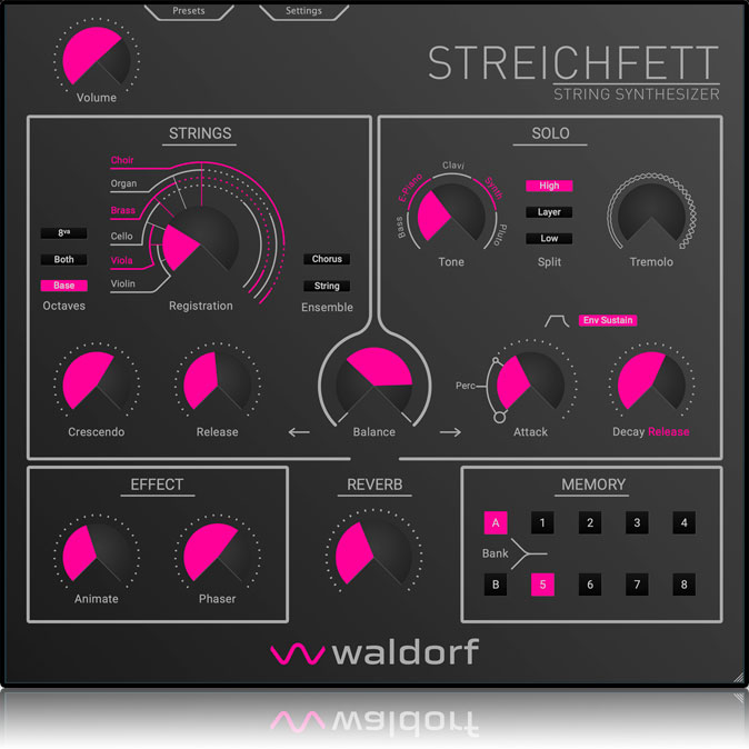 Streichfett combines the best of the previously extinct species of String Synthesizers of the 70s and early 80s. Its dual sound engine features a fully polyphonic String Section and an eight voice Solo Section, which is essential for recreating classic movie sounds from the 70s and 80s. The Ensemble Effect provides depth and movement to the String Section, while the Effects Section adds adjustable Phaser and Reverb effects. Additionally, the Animate Effect can be used to modulate the Strings Registration, allowing spectacular sound morphs.
