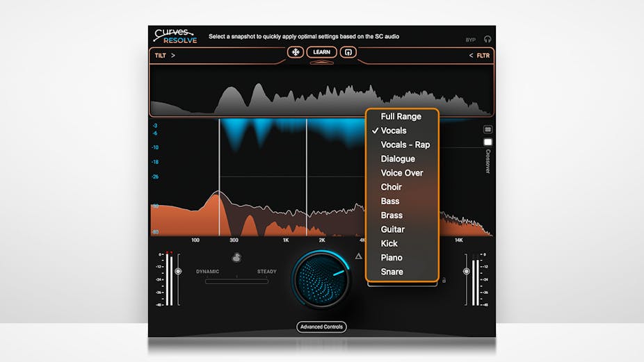 Curves Resolve provides an intelligent way of solving conflicts between multiple tracks in your mix. It processes one track by listening to another, carving space only when and where there’s a clash.