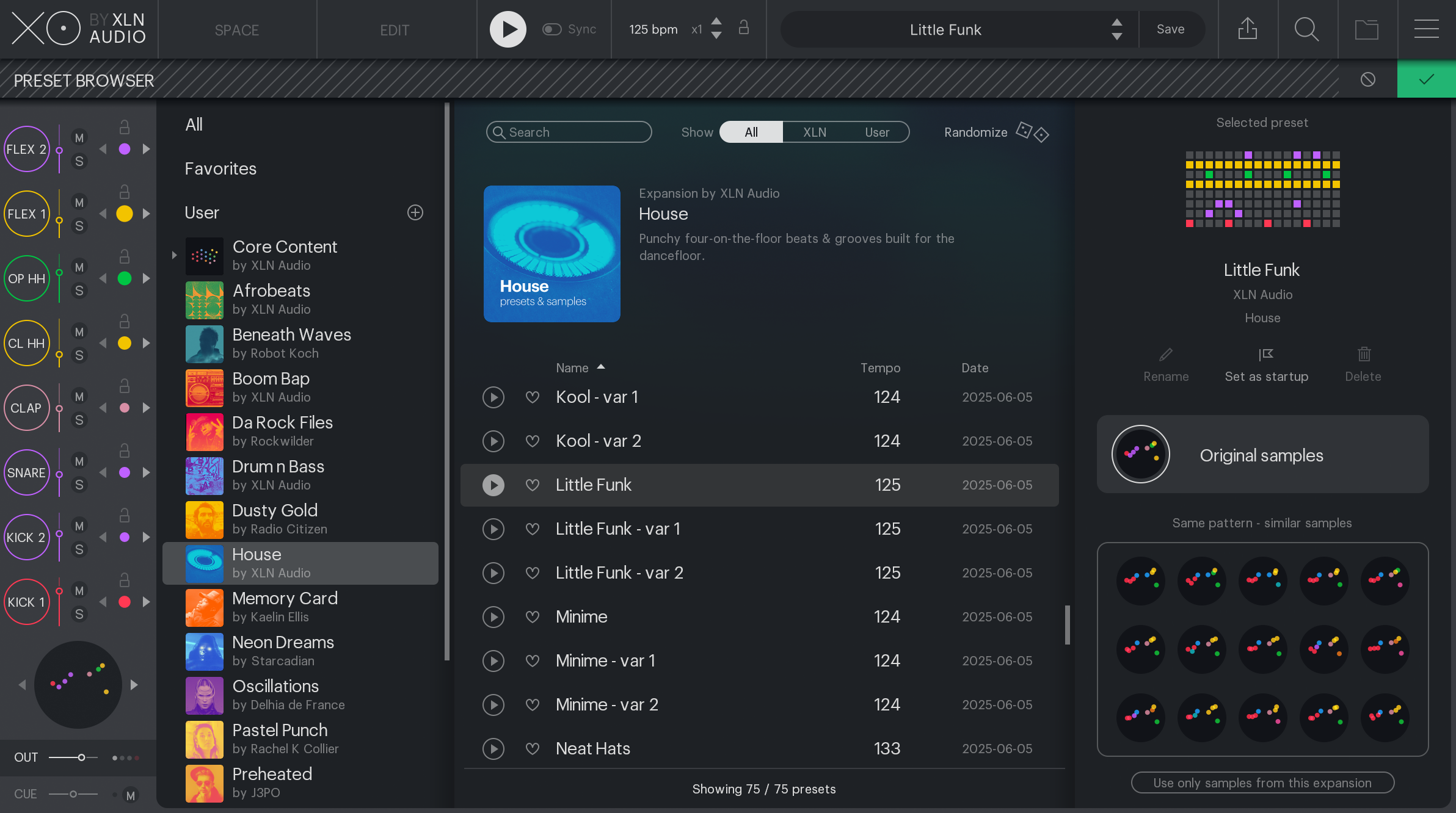 Jump-start your next House production Make your tracks move with signature four-on-the-floor kicks, punchy claps, syncopated hi-hats, and warm, textured percussion. This XO Expansion delivers the very essence of House music, guaranteed to fill the dance floors and make bodies move. Use XO’s powerful features to swap sounds for similar samples with the click of a button. Switch to your favorite sounds from your sample collection, or create wild variations by filtering on a specific range.